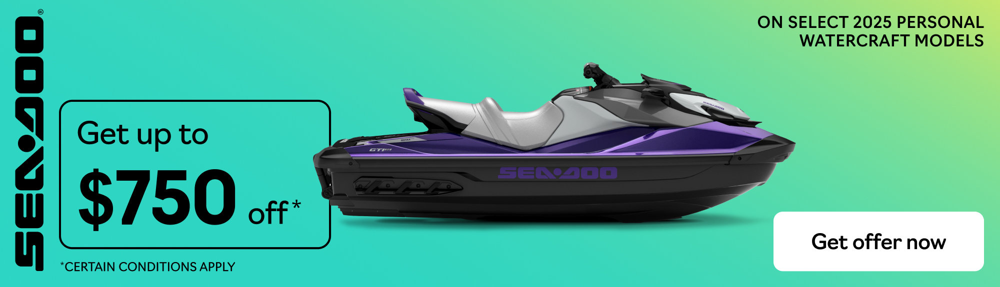 † Get a rebate up to $750: Consumers who purchase new and unused 2025 Sea-Doo Recreation (GTI) models are eligible to a $750 rebate. Consumers who purchase any other new and unused 2025 Sea-Doo models are eligible to a $500 rebate.