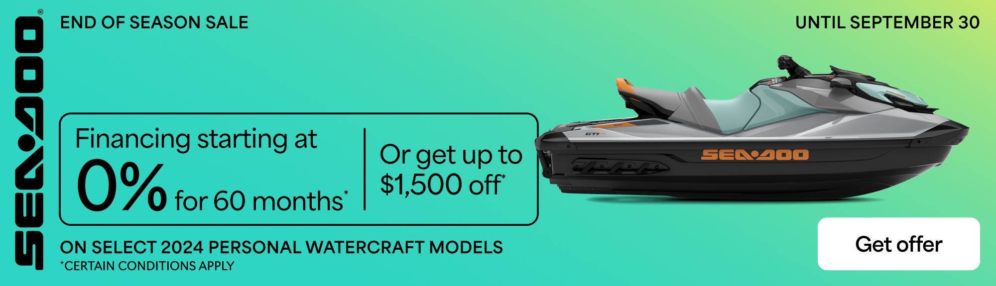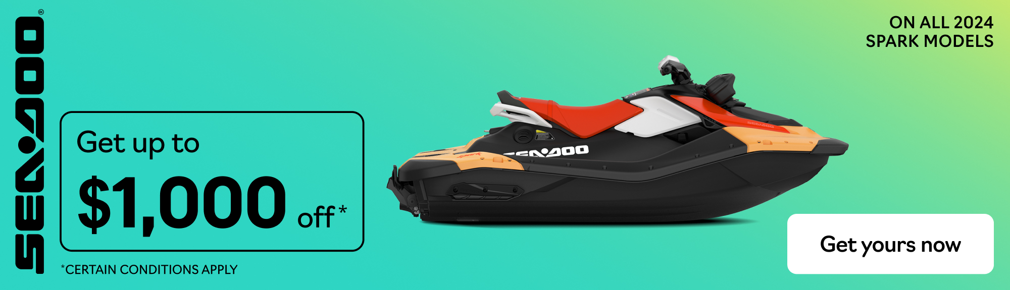 †† Rebate up to $1,000: Consumers who purchase new and unused 2024 Sea-Doo Spark models are eligible to a $1,000 rebate. Consumers who purchase new and unused 2024 Sea-Doo Recreation (GTI) are eligible to a $1,500 rebate. Consumers who purchase any other 2024 Sea-Doo model are eligible to a $1,000 rebate.