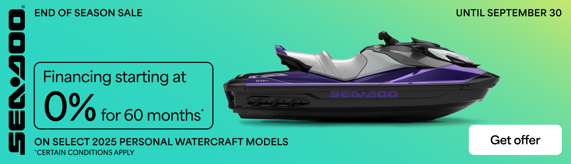 ©2025 Bombardier Recreational Products Inc. (BRP). All rights reserved. ®, ™ and the BRP logo are trademarks of BRP or its affiliates. In the U.S.A., products are distributed by BRP US Inc. Offers valid in U.S.A. only July 1, 2025 to September 30, 2025. The conditions may vary depending on your location and this offer is subject to termination or change at any time without notice. This offer is not refundable, exchangeable or transferable (including from one dealership to another), cannot be redeemed for cash, credit or other products of equivalent value and cannot be combined with any other offer or rebate. Null where prohibited by law. Until supplies last.